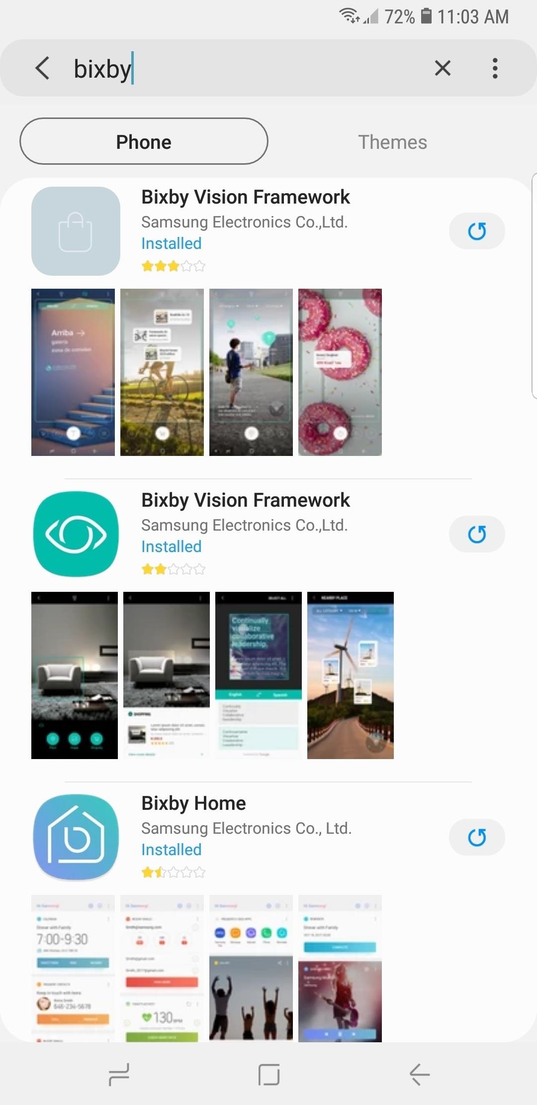 En primer lugar, deberá actualizar Bixby a través de Galaxy Store si no tiene configurada la función de actualización automática para la aplicación. Entonces, abra la tienda de aplicaciones y realice una búsqueda rápida de Bixby ingresándolo en la barra de búsqueda, luego toque cada una de las aplicaciones de Bixby que aparecen en la página de resultados y presione el botón azul "Actualizar" para actualizarlas.