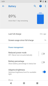 De vuelta en el menú principal de "Batería", cuando toque el ícono de batería grande en la parte superior, estará en el Uso avanzado de la batería al igual que en Android Oreo, donde puede ver un gráfico rápido de la energía restante de la batería y algunas estadísticas de averías.